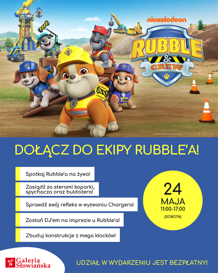 Już 24 maja zapraszamy na niezapomnianą sobotę z Ekipą Rubble’a w Galerii Słowiańskiej! Tydzień przed Dniem Dziecka na najmłodszych czeka wyjątkowe spotkanie z bohaterami „Psiego Patrolu”. Rubble i jego przyjaciele pojawią się na żywo, a wraz z nimi mnóstwo atrakcji i aktywności budowlanych.