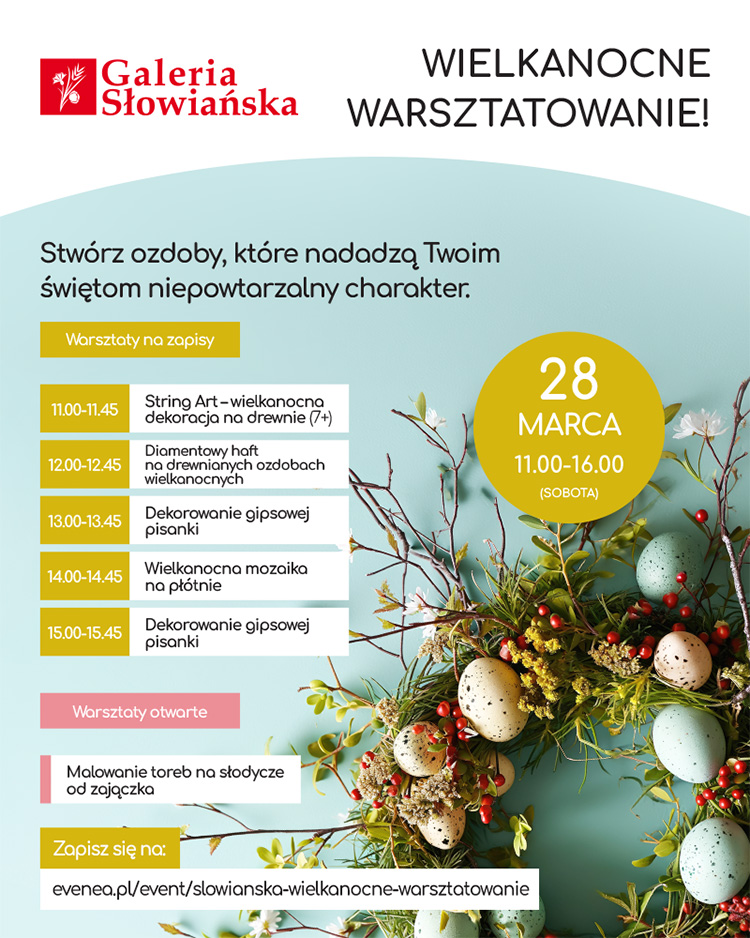 W sobotę, 28 marca, w godzinach 11:00 – 16:00, w Galerii Słowiańskiej odbędą się wiosenno-wielkanocne warsztaty rodzinne. Wydarzenie to doskonała okazja, aby poznać nietuzinkowe techniki rękodzieła i przygotować nowoczesne dekoracje, które ożywią wielkanocny stół.